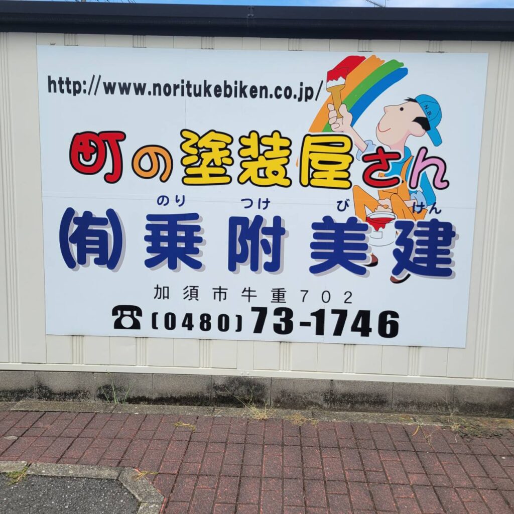 加須市役所騎西支所のすぐそば、知り合いのお宅の車庫に、乗附美建の看板を取り付けさせていただいております。